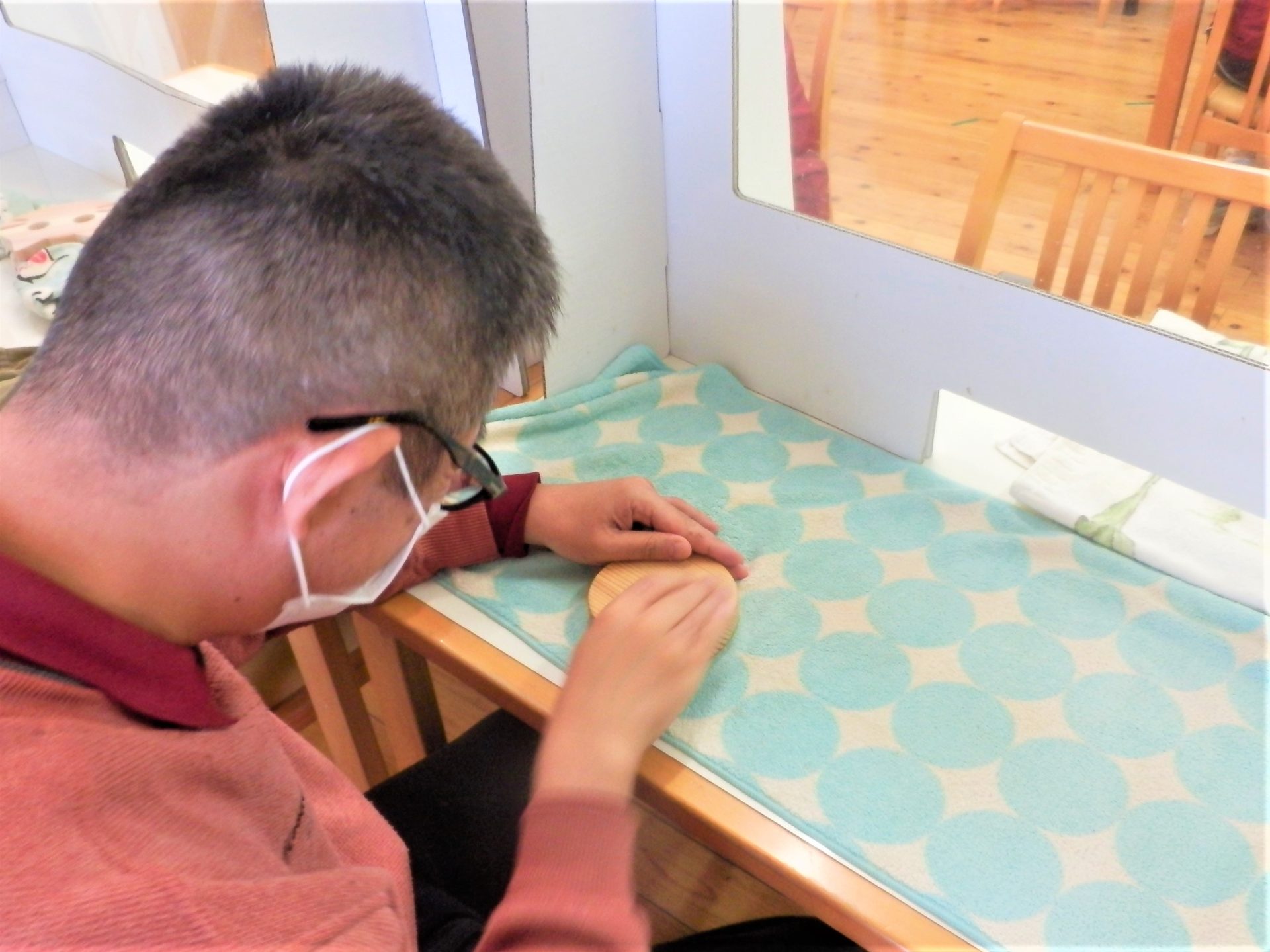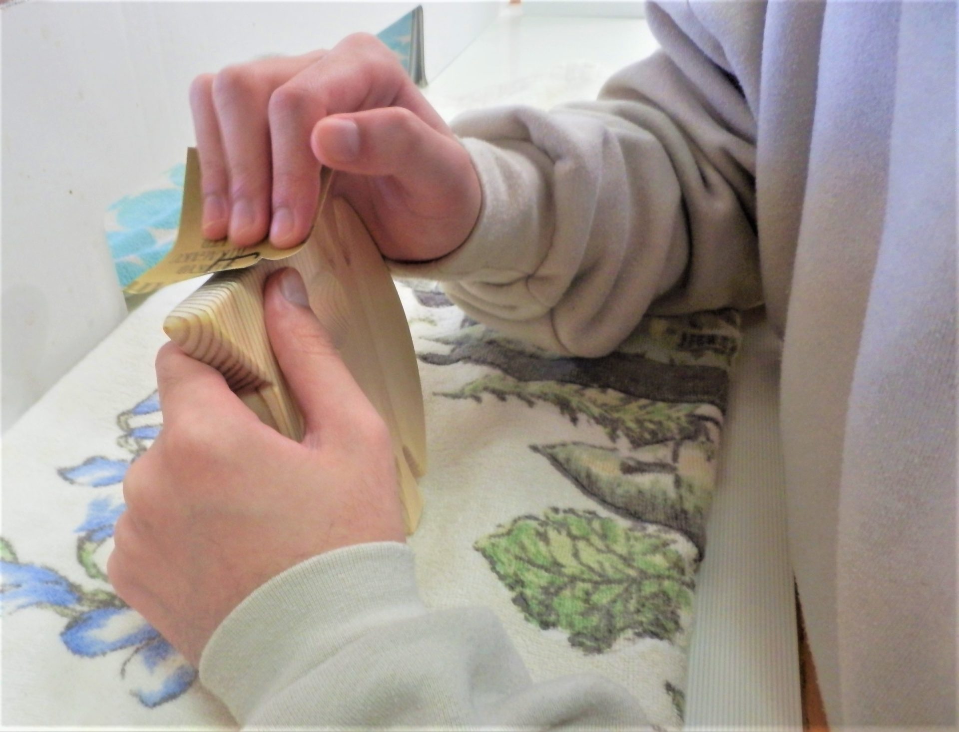 木工班はホールでモクモクとヤスリがけ~♪