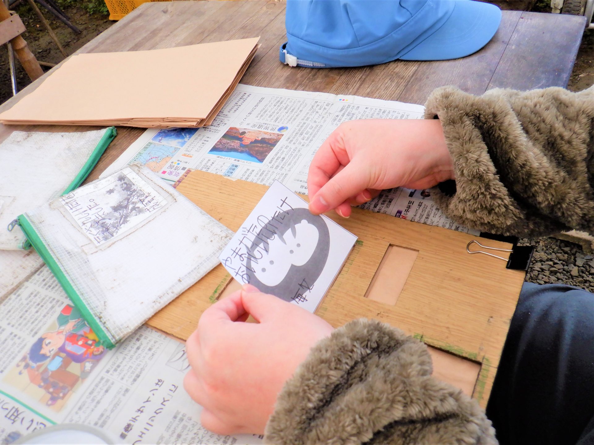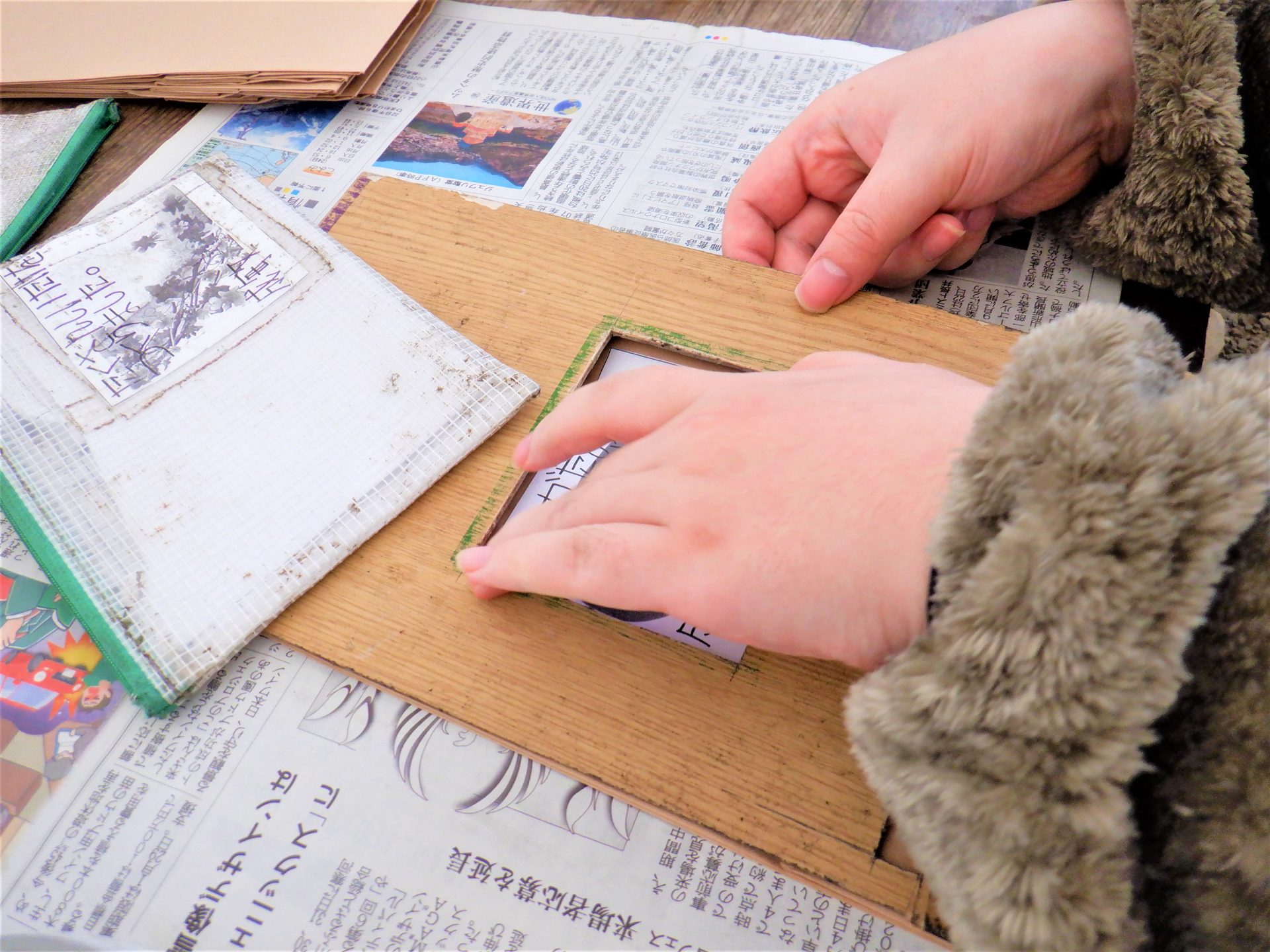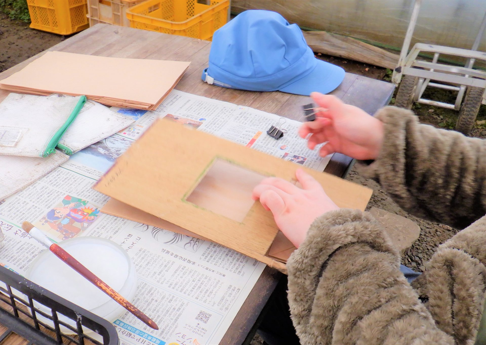 - 「次は紙にノリを塗るよ~隅々まで塗ってね~」