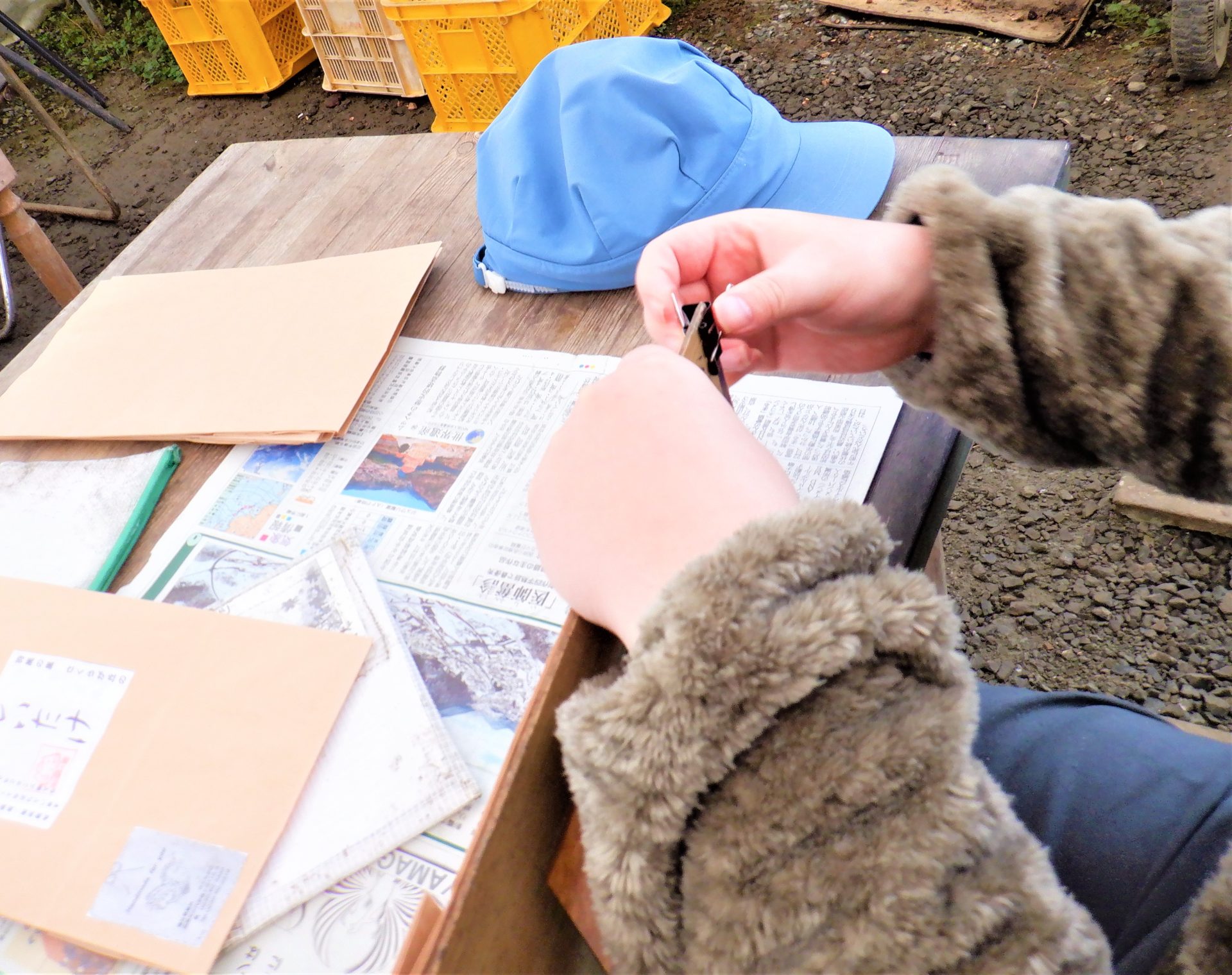 - 「まずは袋にこの木の板を当てて~」」