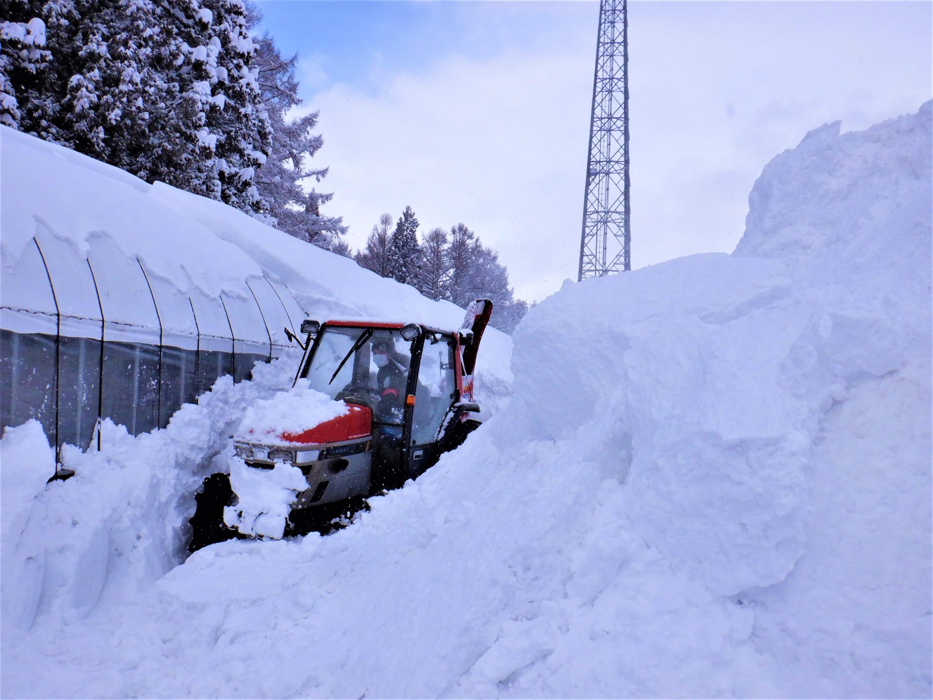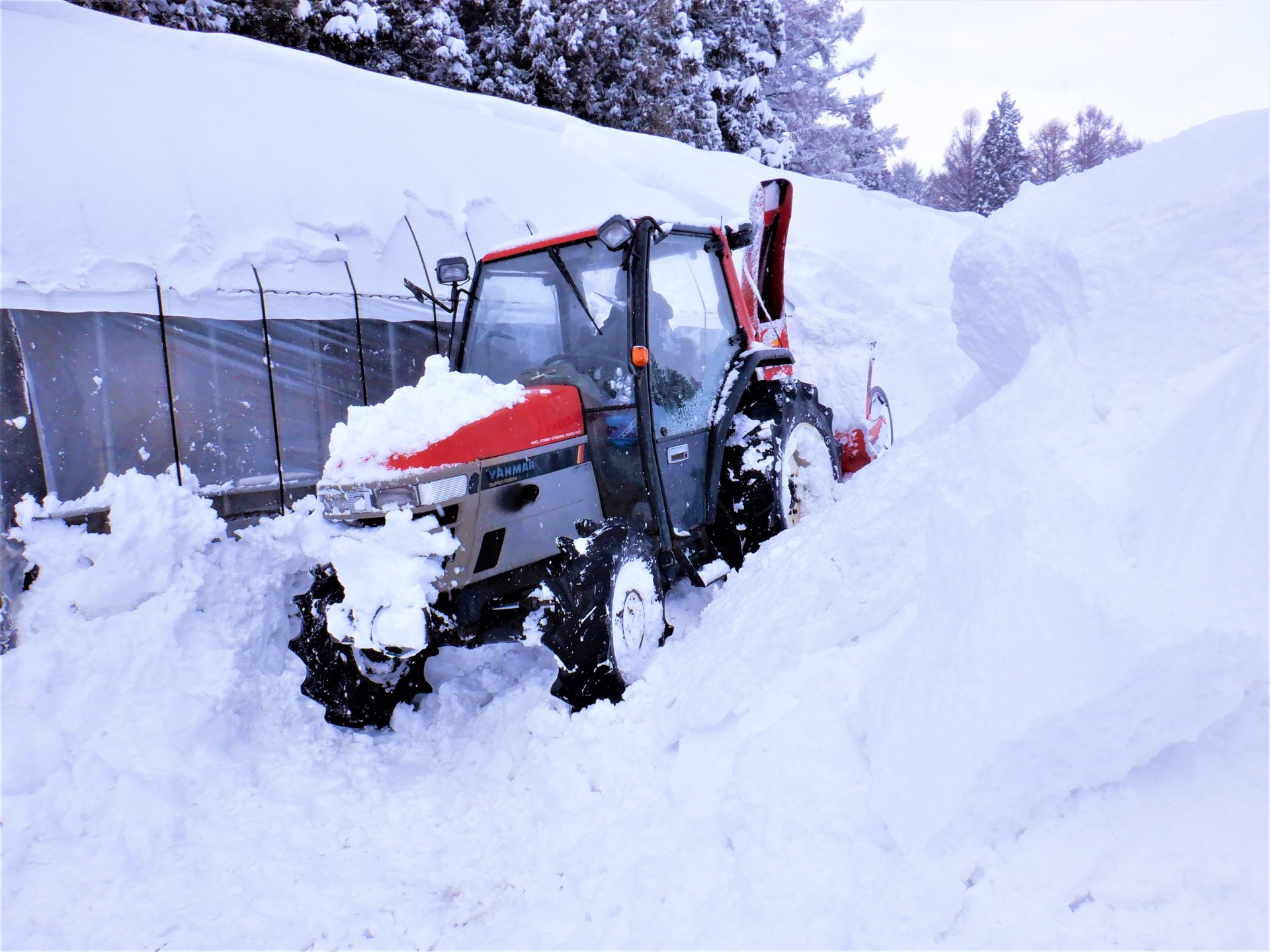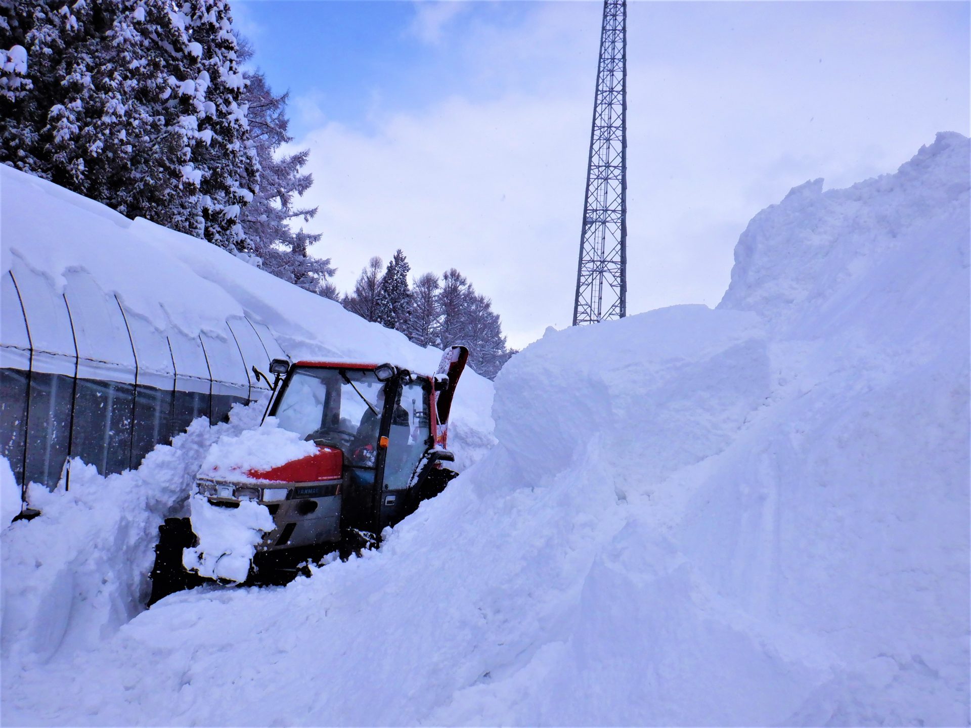 ハウス周りの除雪は危険と隣り合わせ~(@_@)埋もれて出れなくなったこともあるそうな…でもその経験を繰り返して上手になるんだそうです~