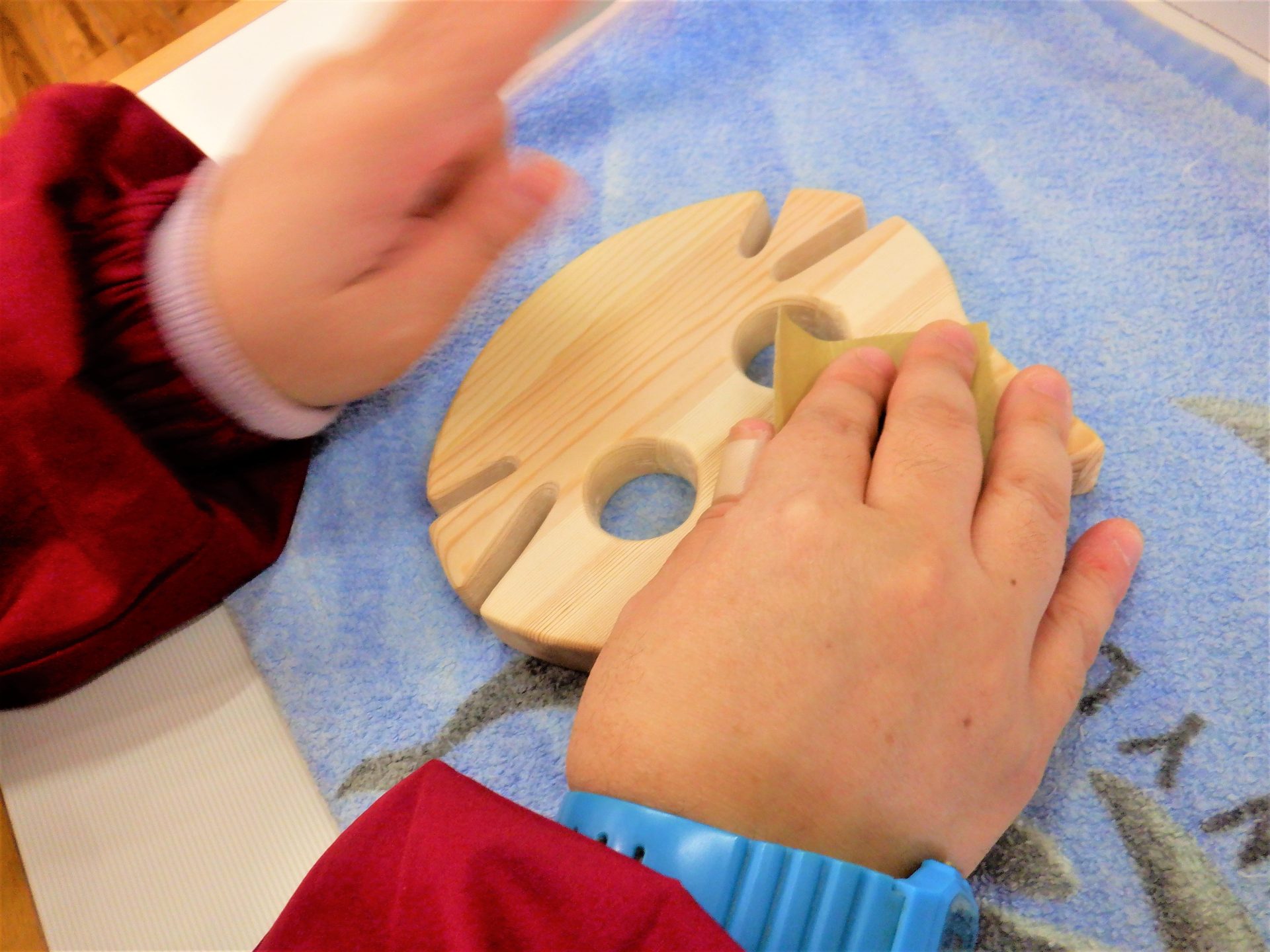 中に戻ると、食堂ホールでは木工班が久しぶりのヤスリがけ頑張ってました~(´▽`*)