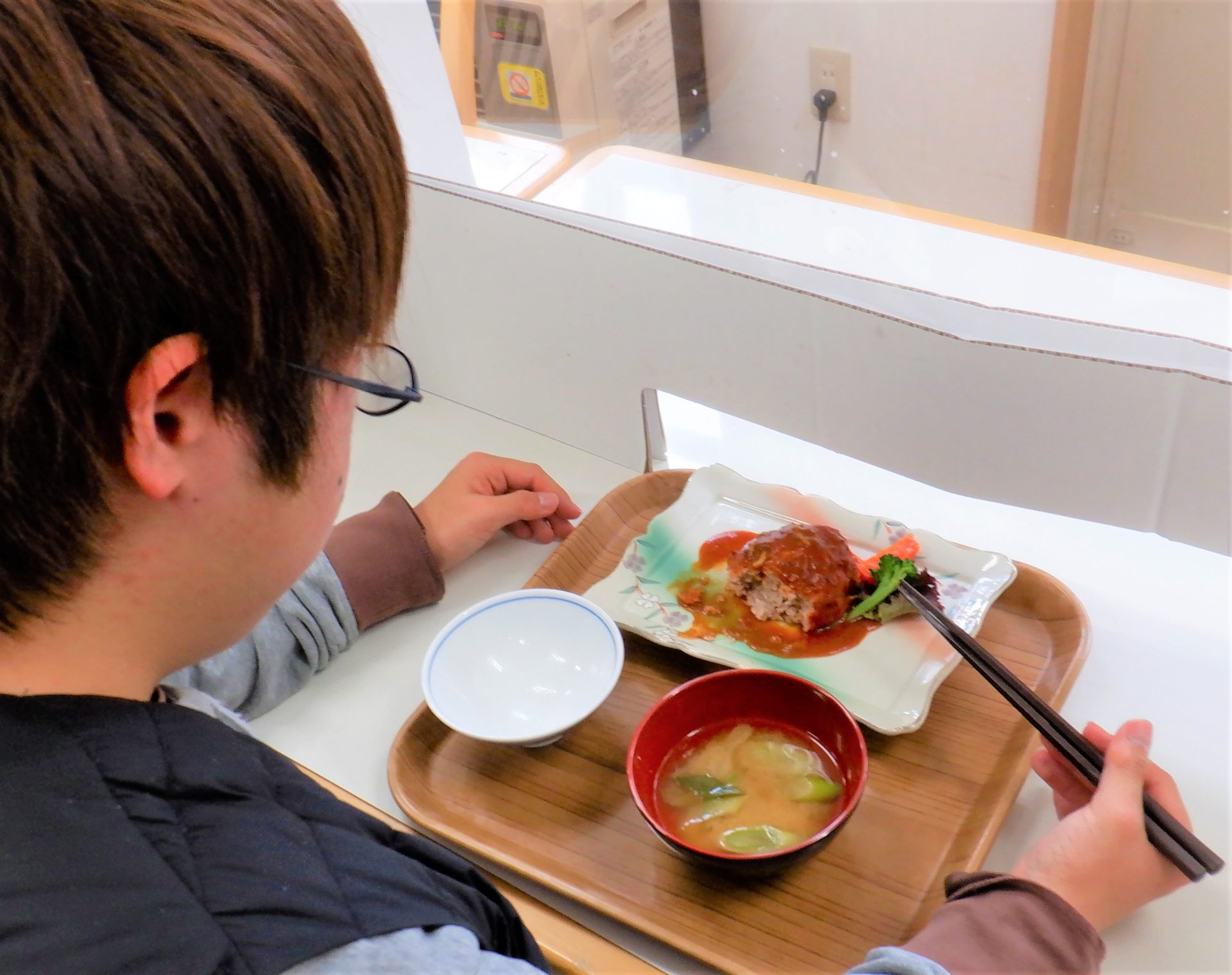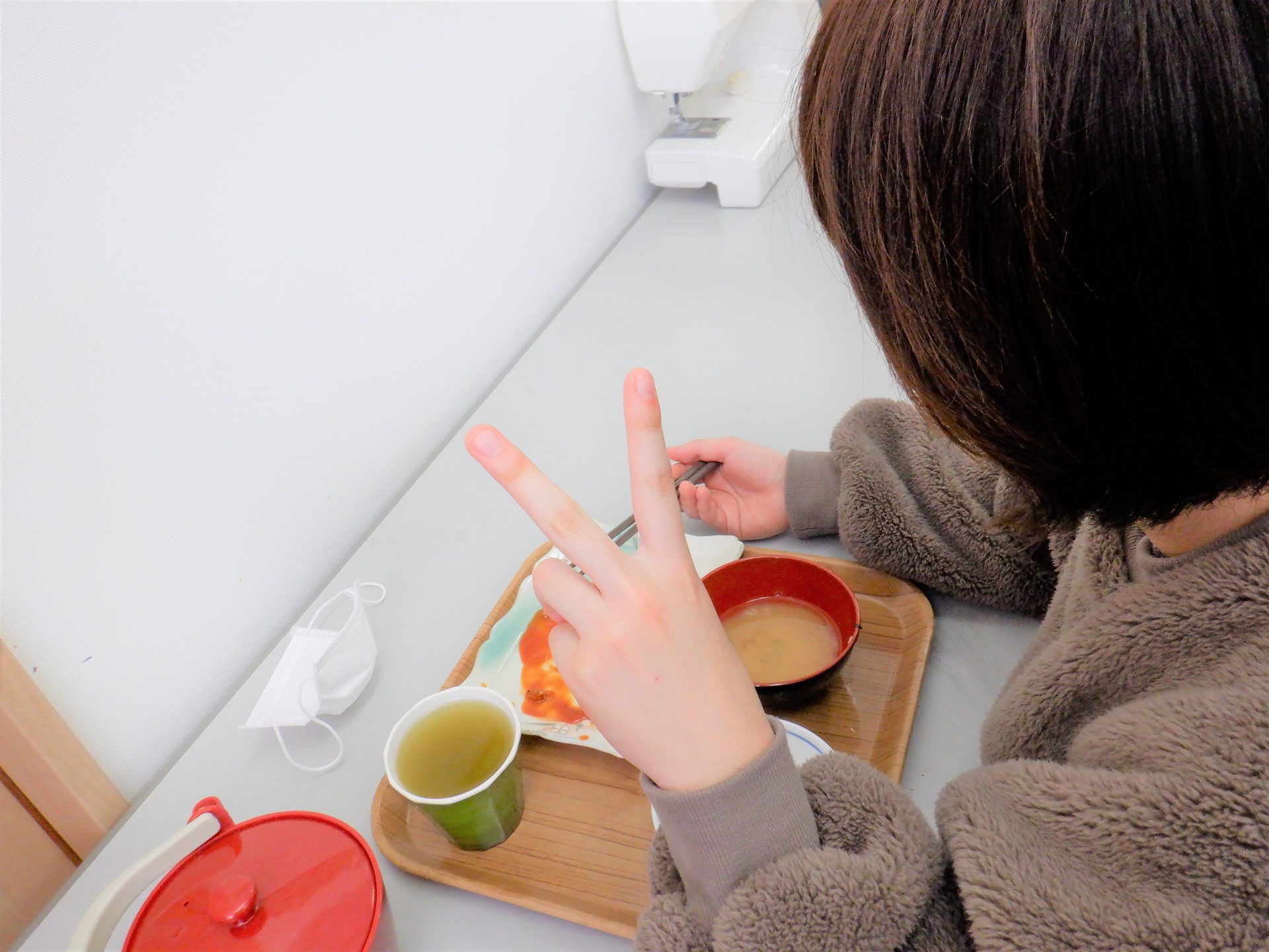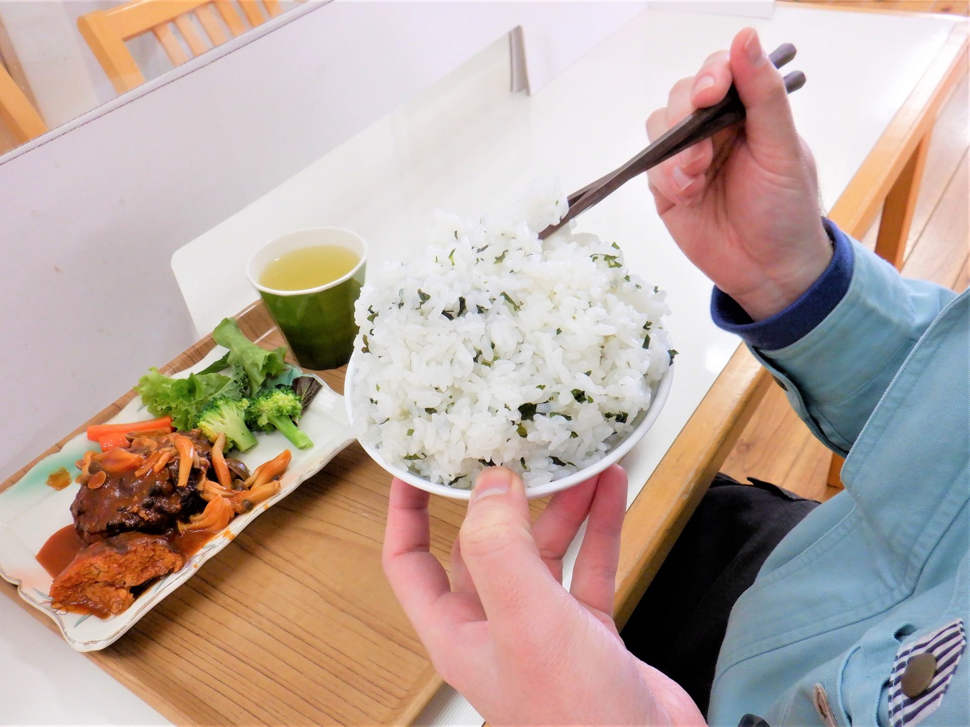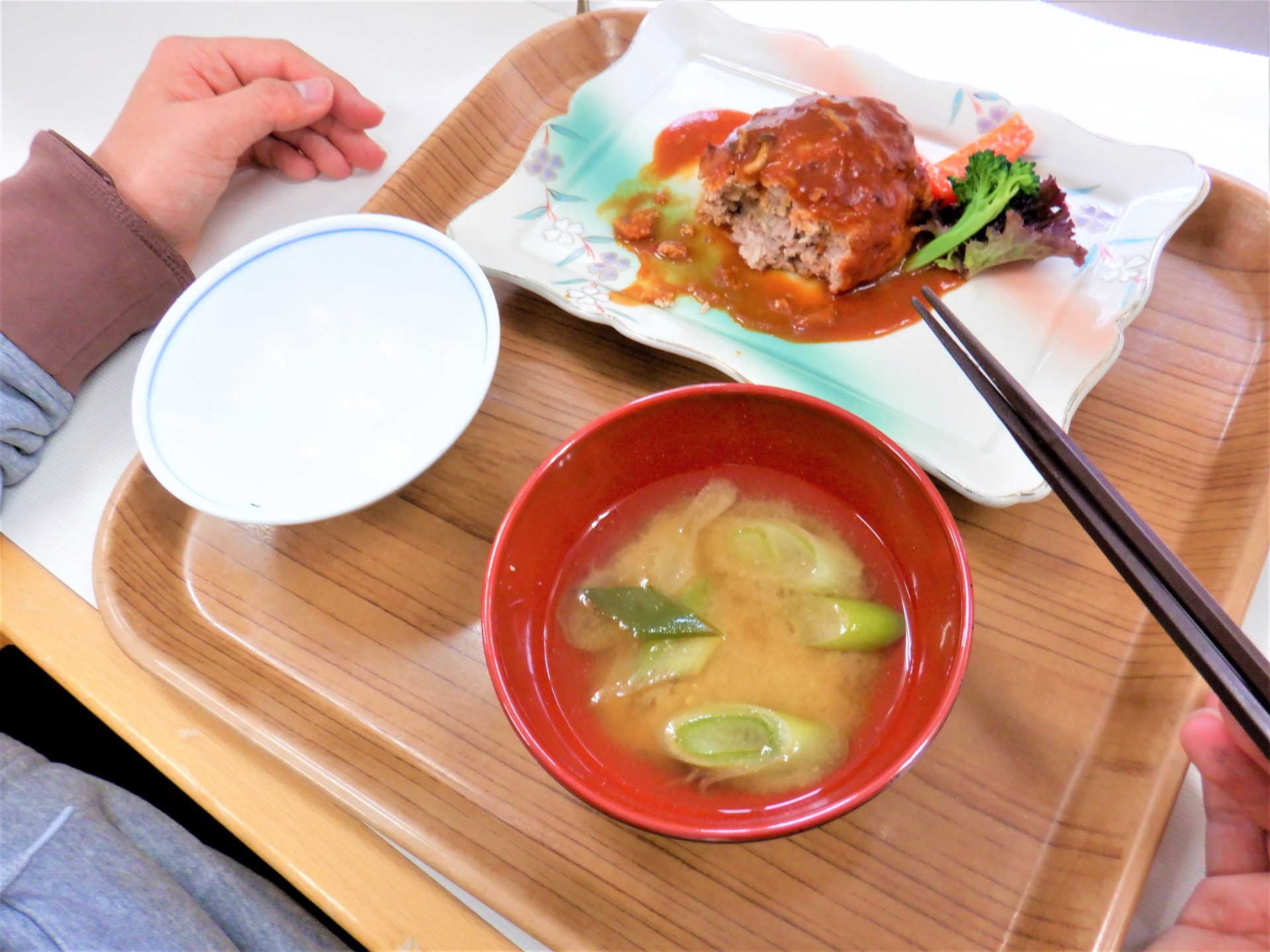 - 「おにぎりとキノコのみそ汁で~す!」