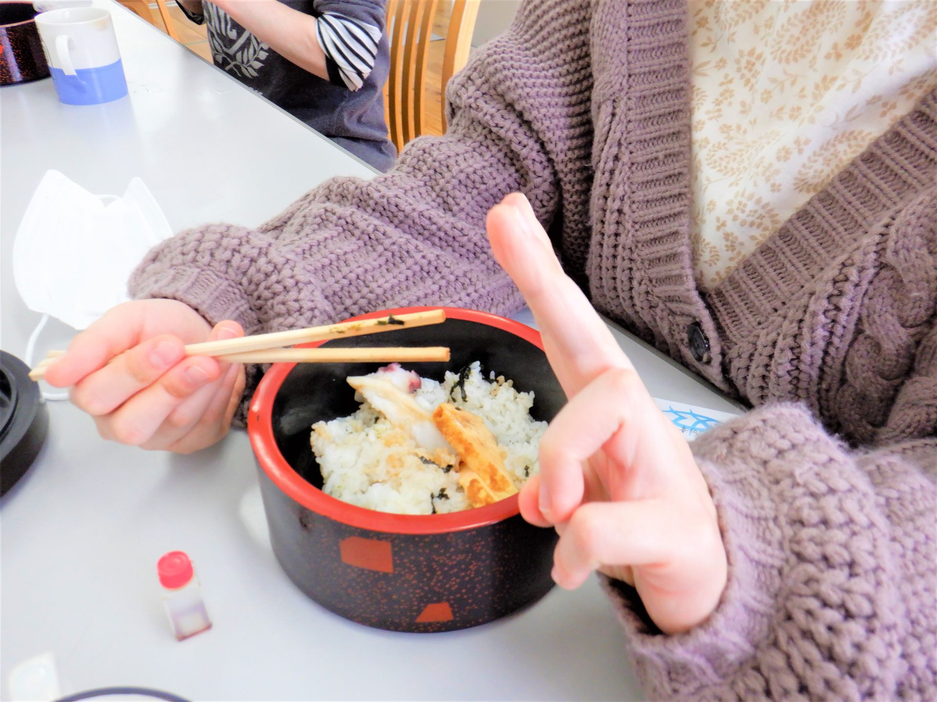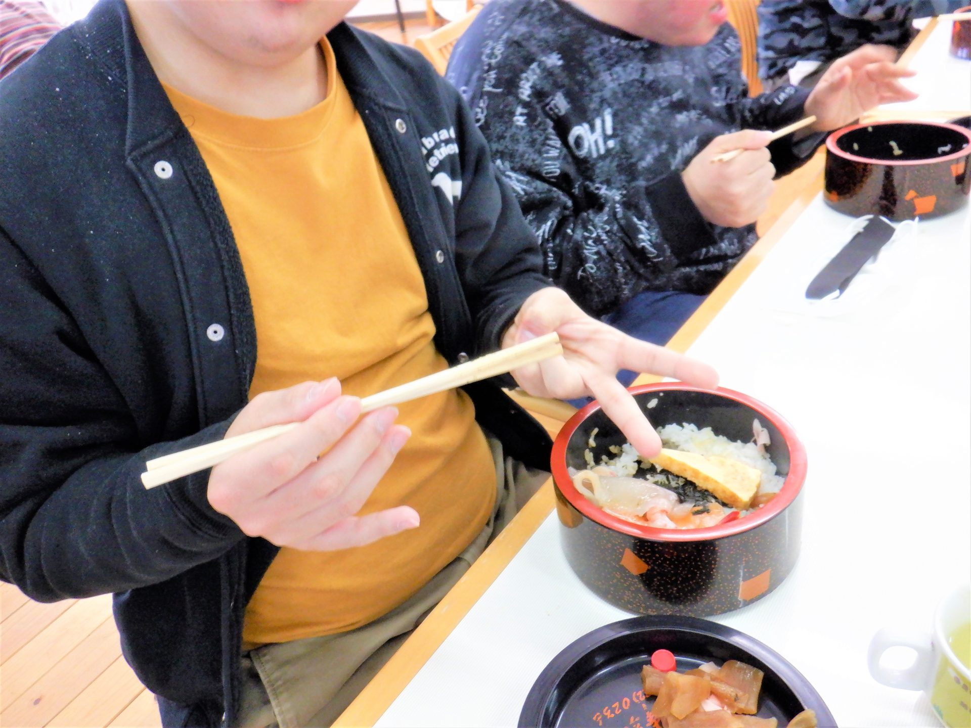 「今日はコロナのせいで寿司の振るまいはできなくなってしまったけれども、海鮮丼を作ってきました。いつもは握りずしだとおかわりできるけど、今回はおかわりできないから、普通よりシャリもえっぺ詰めで、ネタも色んな種類を多めに詰めてきました!利用者の人たちも風邪ひいたりコロナかかったりしないように元気で仕事できるように頑張ってください!」