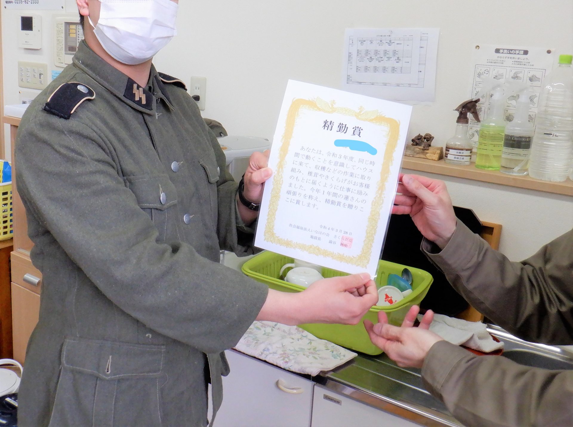 続きまして、全く休まなかった利用者さんに皆勤賞を授与!